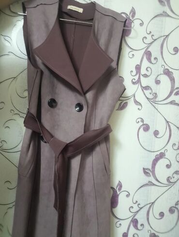 - Material: süet effekti verən parça, yaxa və kəmərdə hamar dərimsi faktura
