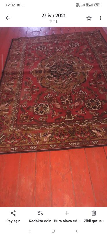 - Xalça: Qırmızı fonlu, klassik mərkəzi medalyon motivli xalça. Kənar bordürlərdə bitki və quş təsvirli ornamentlər, mərkəzdə isə simmetrik naxışlar var. Rəng palitrası: qırmızı, tünd yaşıl, bej və qəhvəyi tonlar. Otaq dekorasiyası və foto/interyer çəkilişləri üçün dekorativ element kimi uyğundur.