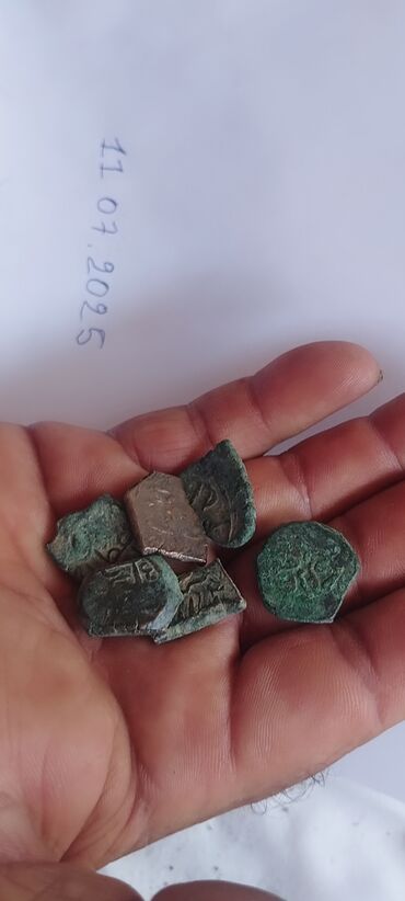 - Köhnə sikkələr dəsti: Ovallaşmış, çoxbucaqlı və düzbucaqlı formalı xırda metal sikkələr. Yaşıl oksid təbəqəsi ilə örtülmüş səthlərində relyef yazılar və nişanlar seçilir. Fərqli ölçülər və kəsimlərdən ibarət qarışıq dəstdir. Numizmatika və tarixi kolleksiya məqsədləri üçün nəzərdə tutulur.