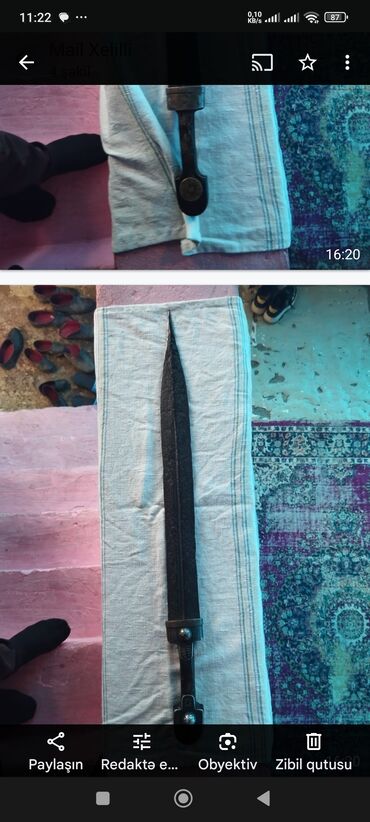 - Qılınc: Düz, dar və ucu iti bıçaq tipli uzun metal palıdma. Üzərində dekorativ relyef detal və iki nöqtədə bərkidici/furnitura elementləri görünür. Sap hissəsinə keçiddə metal “garniturlar” var. Foto boyu ölçü nisbəti uzun olduğunu göstərir; ekspozisiya və dekor üçün uyğun tarixi üslubda əşya təsiri yaradır.
