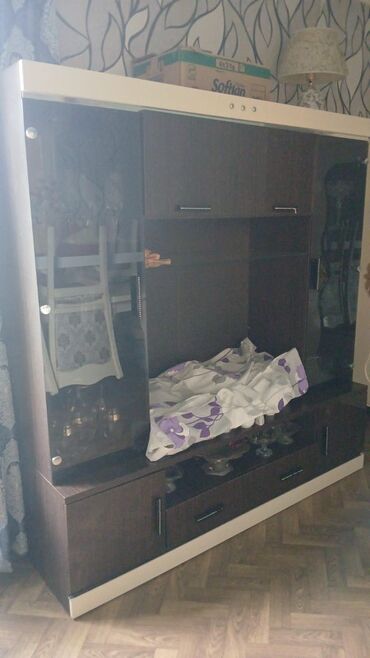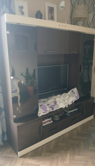 - Orta hissə: televizor üçün geniş yer; üst tərəfdə saxlanma üçün qapalı dolab; əlavə açıq rəflər