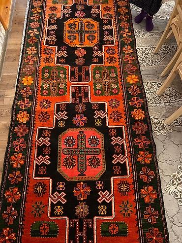 Xalça – əl toxuması, zərif naxışlı - Növ: Uzun dəhliz xalçası (yolluq) - Material: Təbii yun iplik - Texnika: Əl işi, sıx ilməli toxunuş - Rəng palitrası: Tünd qırmızı fon, yaşıl, yasəməni, çəhray...