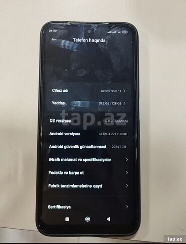 Xiaomi Redmi Note 11 – 4 kamera modullu, böyük ekranlı smartfon. Əsas xüsusiyyətlər: - Model: Redmi Note 11 (şəkildə “Haqqında” bölməsi göstərilib) - Yaddaş: 128 GB daxili yaddaş (təxminən 101.5 G...