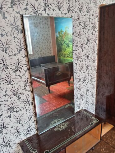 - Güzgülü tualet masası – böyük vertikal güzgü, üst hissədə şüşə/taxta səth, aşağıda bölməli dolab; fasadda eyni üslubda naxışlar.