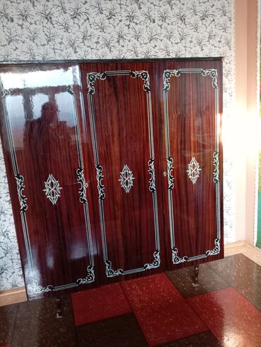 - 4 qapılı şkaf – parlaq tünd ağac teksturalı fasad, dekorativ naxışlı panellər, hündür ayaqlar.