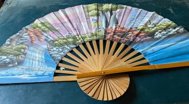 Dekorativ böyük yelpik (divar üçün) - Şərq üslubunda iri ölçülü dekorativ yelpik - Təbii bambuk/taxta çərçivə və qatlanmış kağız/parça səth - Üzərində rəngli çiçəklər, quşlar və qaya kompozisiyalı...
