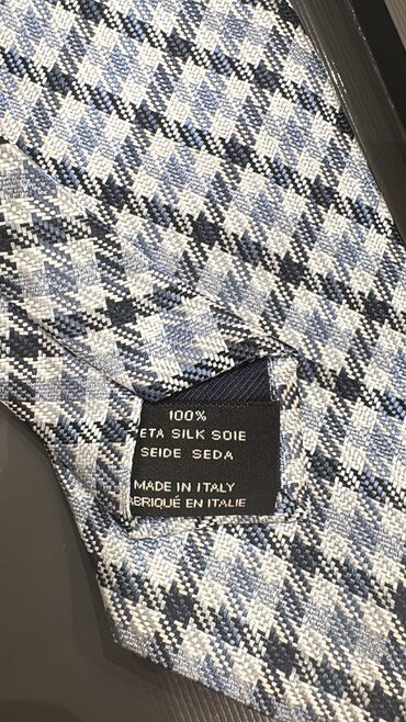 Qalstuk – La Pescara Brend: La Pescara - Rəng: tünd bənövşəyi-bordo tonlarında - Naxış: xırda həndəsi/desenli, mavi və çəhrayı işarələrdən ibarət. Təzədir etiketi üstündə Whtsp var