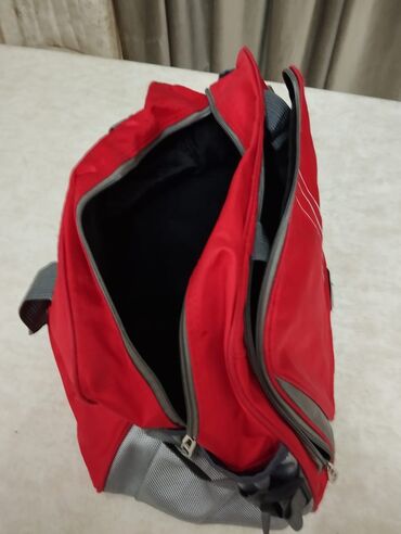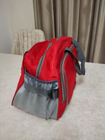 Qırmızı rəngli, yan tərəfdən kiçik cibləri olan idman çantası. Rahat daşımaq üçün tutacaqları var. Səyahət və ya idman zalına getmək üçün əlverişlidir.