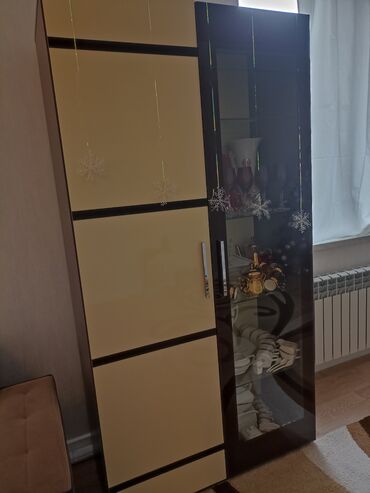 - Dizayn: İki bölməli şkaf – sol tərəf qapalı panelli, sağ tərəf şüşə qapı.