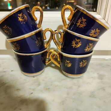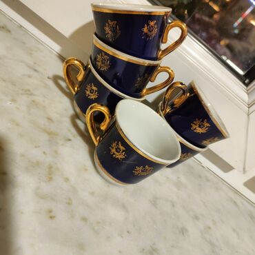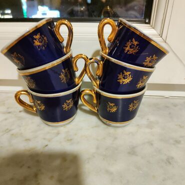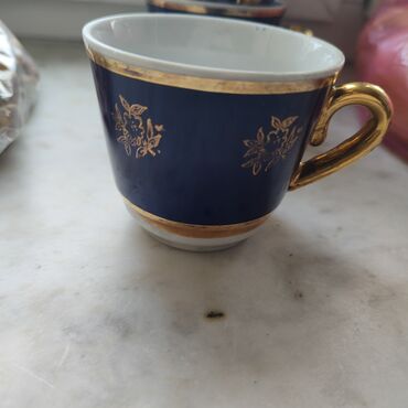 Məhsul: Thun Karlovarský Porcelán fincan Mənşə: Çexiya (Czech Rep.) Material: yüksək keyfiyyətli sərniş (porcelan) Rəng və bəzək: dərin kobalt-mavi üst zolaq, qızılı ornamentlər və qızılı rəngli zə...