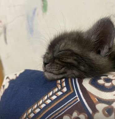 Gözəl zolaqlı balaca pişik balası - Cins: ev pişiyi (tabby/zolaqlı) - Rəng: boz-qara zolaqlar, ağ sinə və pəncələr - Yaş görüntüyə əsasən: balaca, körpə - Xarakter: sakit və mehriban, qucaqda yatm...