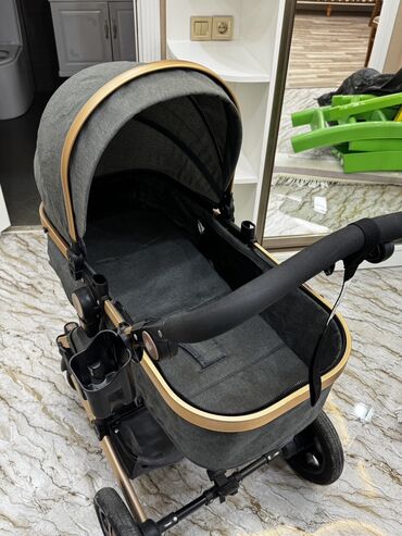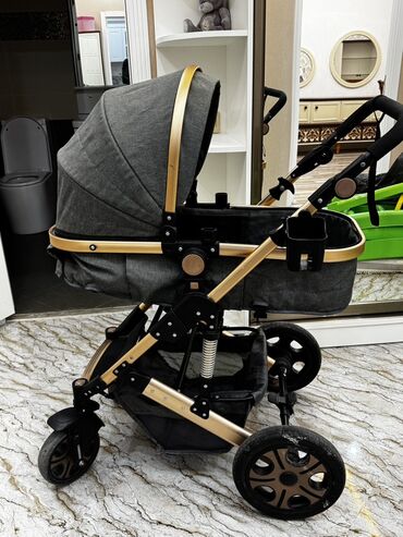 Uşaq arabası – şık dizayn və rahatlıq - Rəng: qara parça, qızılı/bronza tonlarda şassi və detallar - Tip: körpə beşiyi tipli 2-in-1 araba (layla tipli uzanma bölməsi), tənzimlənən kapot - Şassi: y...