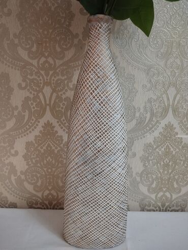 Məhsul: Dekorativ döşəmə vaza Təsvir: - Rəng: Ağ (yüngül mərmər naxışlı çalarlarla) - Material: Sərt kompozit/keramika tipli - Forma: Aşağı hissəsi kürəvi, boynu uzun və incə, yuxarı hissəsi dalğa...