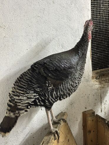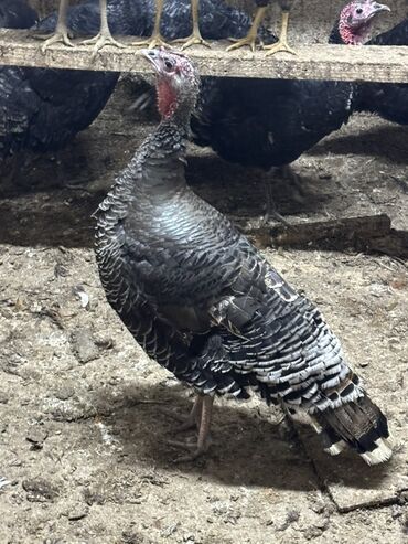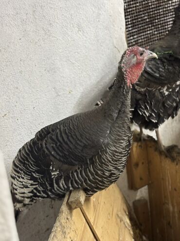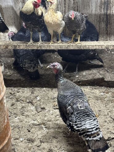 - Şəkillərdə qara-boz rəngli, zolaqlı quyruq və qanadlara sahib hind toyuqları.