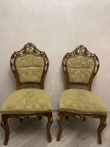 - Klassik üslubda 2 ədəd yemək otağı stulu - Tünd qəhvəyi taxta karkas, yuxarı hissədə qızılı rəngdə oyma güllü dekor - Arxa söykənəcək və oturacaq hissəsi eyni parça ilə – qızılı damar naxışlı, be...