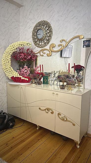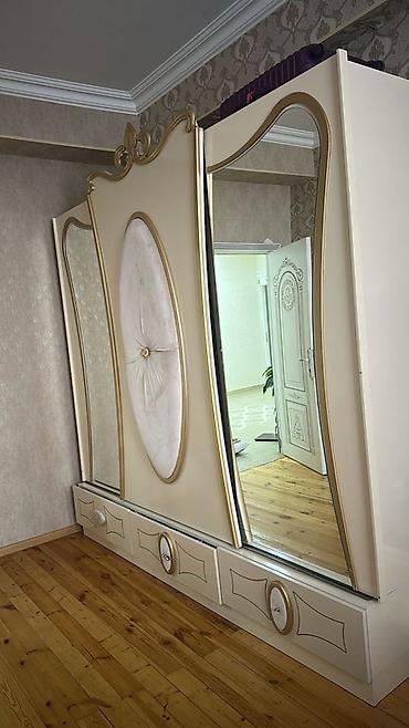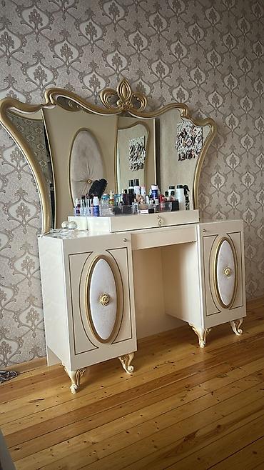 - Güzgülü makiyaj masası: üç hissəli güzgü, ortada kiçik çekmece, iki yan şkaf bölməsi, barokko üslublu qızılı ayaqlar və oval dekor panellər.