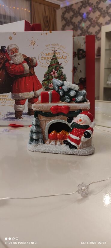 3) Ocaq kompozisiyası – kamin, üzərində hədiyyələr və qarla örtülü ağac; kənarda qar adamı fiquru.