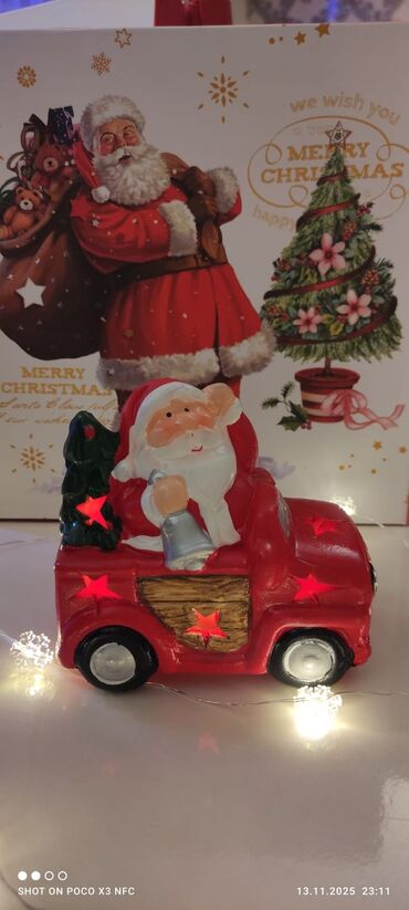 2) Qırmızı maşın – sürücü yerində Santa, yan tərəflərdə ulduz kəsikləri, taxta teksturalı panel detallar.