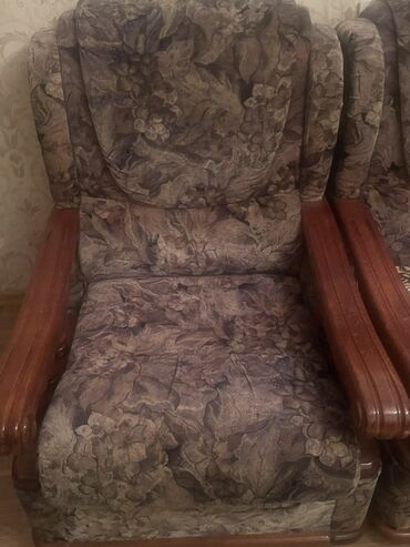 Klassik üslubda mebel dəsti: 2 nəfərlik kreslo və 3 nəfərlik divan.Divan açılır kravat kimi istifade olunur… - Rəng: boz-bej yumşaq parçalı oturacaq və arxa hissə, tünd qəhvəyi ağac karkas. - Mate...