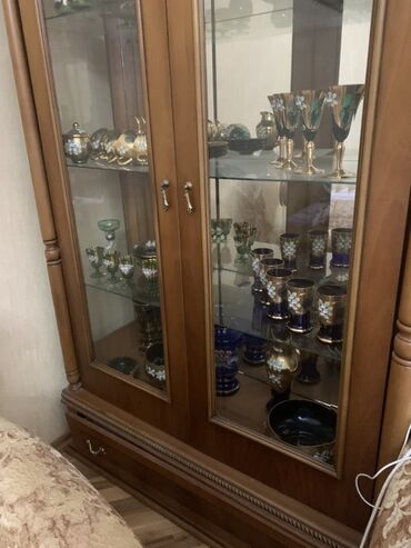 - Vitrin şkaf: Masif ağac görünümlü korpus, yuxarı hissədə relyefli dekor və ornamental aplikasiya. İki şüşə qapı, içəridə şüşə rəflər – qab-qacaq, bəzək əşyaları və kolleksiyalar üçün idealdır. Aşağı hissədə dartma çekmece. Qapılarda metal tutacaqlar. Rəng: isti qoz-qəhvəyi.