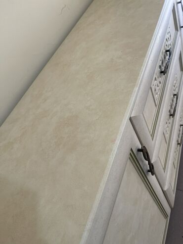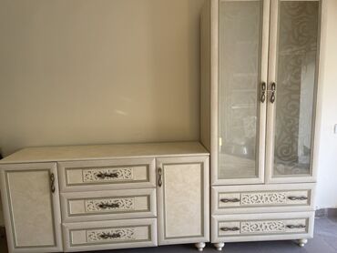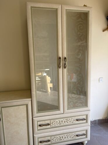 - Sağ hissə: ikiqat şüşəli vitrin – içəridə rəflər; aşağıda 2 böyük çekmece