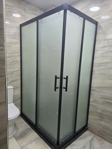 Şüşə duş kabinası və aksesuarları - Material: temperli mat (qumlu) şüşə panellər, paslanmayan metal/profil karkas - Quruluş: sürüşən iki qapı sistemi, alçaq küvet/tray üzərində - Ölçü: standart du...