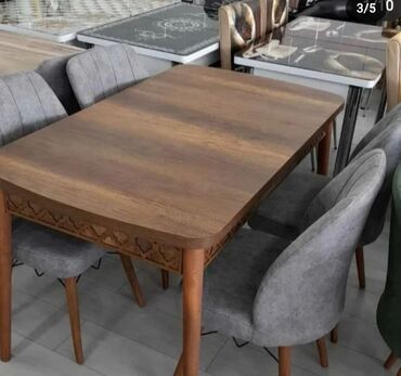 - Yemək otağı dəsti: Masa (100 sm x 200 sm) + 6 stul. Klassik üslubda, qızılı oymalı detallar, yumşaq, düyməli kürəklər, naxışlı üzlük. Masa səthi parlaq, kənarları dekorlu, möhkəm ayaqlar. Şəhər d...
