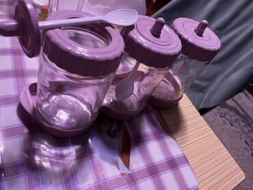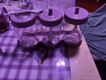 Dekorativ kiçik qab – bənövşəyi şüşə korpuslu, üzərində ağ çiçək naxışları və qızılı xəttlə bəzədilmiş. Yuxarı hissəsi metal rəngli parlaq qapaqlıdır (vida tipli). Kompakt ölçülü olduğuna görə ədvi...