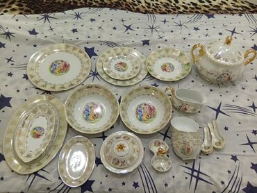 - Üsul: klassik dekor – mərkəzdə rəngli rokoko səhnələri, kənarlarda qızılı ornamentlər; qızılı tutacaqlar və haşiyələr