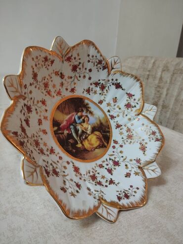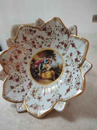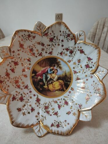 - Dekor: mərkəzdə klassik romantik süjetli təsvir; kənarlarda əl işi qızılı haşiyə və xırda çiçək naxışları