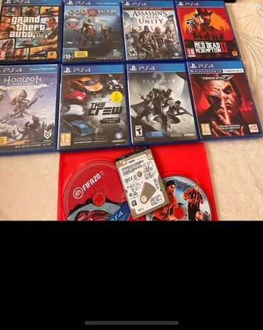 PS4 oyun disk kolleksiyası Şəkildə müxtəlif janrlarda PlayStation 4 üçün orijinal disk oyunları görünür. Seçimə daxil olan başlıqlardan bəziləri: - Far Cry 5- 30 azn - The Witcher 3: Wild Hunt – G...
