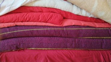 Qırmızı rəngdə, güllərlə işlənmiş və qapitone naxışlı yataq dəsti. Dəstə yorğan və yastıq üzləri daxildir. Yorğanın üzərində qəhvəyi rəngli damalar və naxışlı gül detalları var. Yastıq üzləri qırmı...