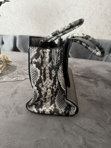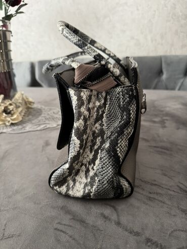 Brend: Mango. Cox az istifade olunub Model: çiyin/çarpaz çanta Dizayn: ilan dərisi naxışlı (boz-qara-bej tonlarda) Material: süni dəri teksturalı üst, daxili qara parça astar Bağlanma: ön his...