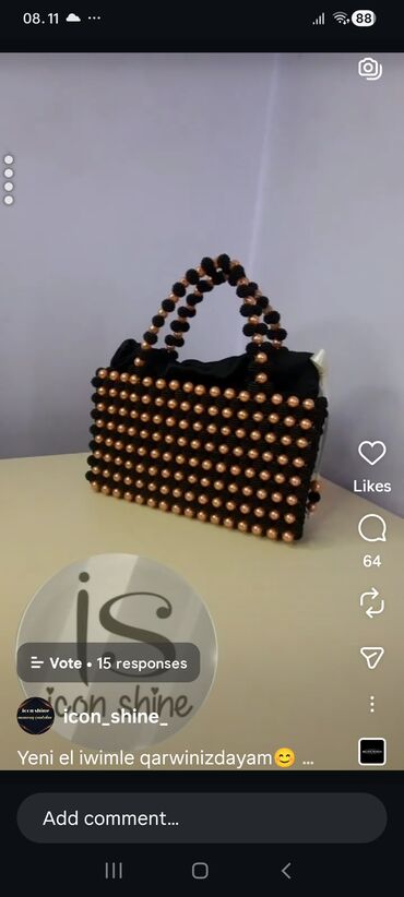 - Dizayn: Tamamilə əl ilə yığılmış muncuq naxışlı çantalar. Fərqli formalar – kvadrat, ürəkvari, dairəvi və klassik tote.