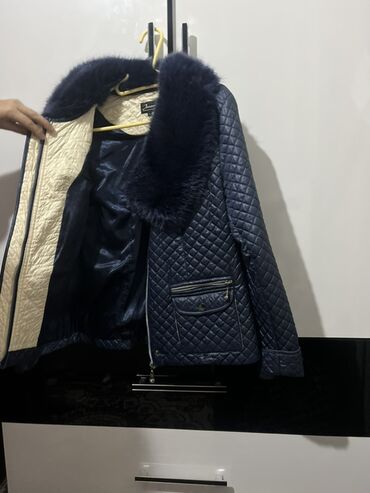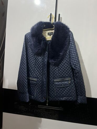 Qadın üçün şık göy rəngli q quilted təmiz dəri (romblı tikişli) qısa pencək. Geniş süni kürk yaxalıqla dizayn edilib, fermuarlı ön bağlama. Ön hissədə 2 ədəd fermuarlı cib və 2 ədəd qapaqlı cib. İçi isti, açıq krem rəngli astarlıdır, əlavə olaraq iç hissədə tünd göy atlas astar detalı görünür. Gündəlik və ya şəhər stilinə uyğun, yüngül və rahat kəsim. Modern görünüş və praktiklik bir arada. Marka: Zunnan (etiketdə). Rəng: tünd göy. Material: quilted parça, süni kürk yaxalıq. T