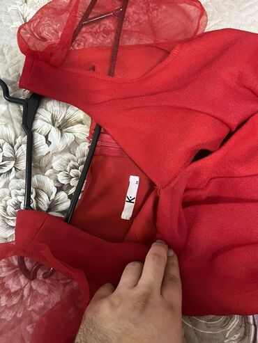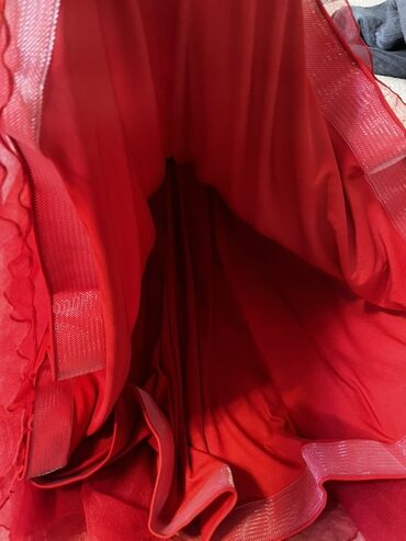 Paltar asqı ilə təqdim olunur, fotolarda daxili qatların və ətəyin həcmini göstərən yaxın planlar var. Qırmızı tonu səhnədə və fotolarda seçilmək istəyənlər üçün ideal seçimdir.