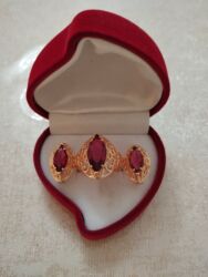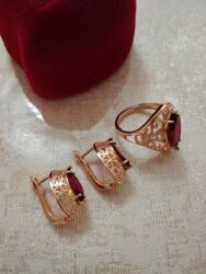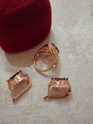 - Daşlar: bordo-qırmızı, markiz kəsim mərkəzi daşlar (üzükdə iri, sırğalarda uyğun cüt); parlaq və dərin rəngli.