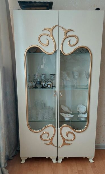 - İki qapılı vitrindən ibarət bufet: şüşə vitrin qapıları, içəridə 3 səviyyəli şüşə raflar, ön hissədə qızılı bəzək elementləri, kristalvari asqılı tutacaqlar, relyefli dekorlu ayaqlar.