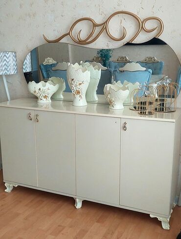 - Geniş komod: dörd qapılı korpus, üst hissədə iri dekorativ güzgü; güzgünün çərçivəsi dalğalı-qıvrım qızılı ornamentlə vurğulanıb. Komodun tutacaqları və ayaqları vitrindəki kimi klassik üslubdadır.