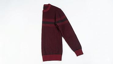 Bordo və tünd göy rənglərin kombinində kişi sviteri. - Model: uzunqol, yarı-balqabaq (yarımboğaz) yaxalı - Rəng və dizayn: ön hissə bordo üzərində incə qırmızı naxışlarla, qollar və yaxa tünd göy; ...