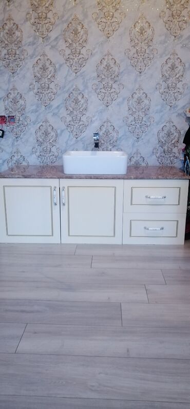 - Üst hissə: mərmər görünümlü tezgah (qəhvəyi tonlarda), ortada kvadrat formalı keramika qoyma lavabo