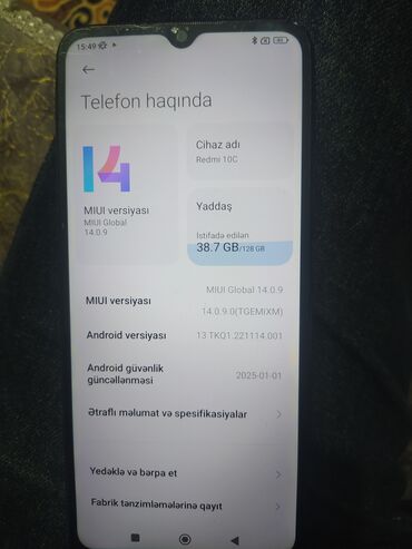 - Yaddaş: 128 GB (hazırda 38.7 GB istifadə olunub)
