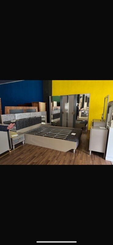 Yataq otağı mebel dəstləri 1) Tünd boz-qızılı xəttli model - Dördqapılı güzgülü şkaf - 2 tumbalı çarpayı - Komod + güzgü - Matras hədiyyə - Qiymət: 1250 AZN (şəkildə göstərildiyi kimi) 2) Krem/qə...