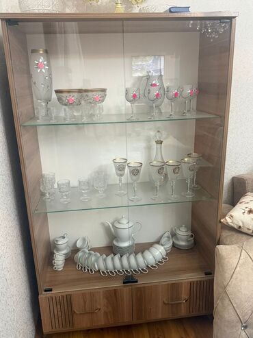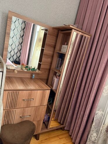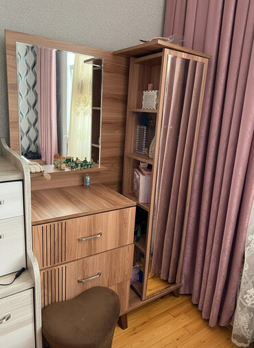 (Qiymət razılaşma yolu ilə)Mebel dəsti – qarderob, güzgülü şkaf, divar rəfləri və masa - Material: ağac teksturalı laminat (açıq qoz rəngi), metal tutacaqlar. - Qarderob: çoxbölməli konstruksiya, ...