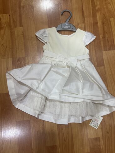 Ağ rəngli qız uşağı üçün ziyafət/libas paltarı. - Yuxarı hissə: zərif krujeva və incə naxışlı faktura, uzun qollar. - Yaxa: dairəvi. - Bel hissəsi: hamar qurşaq, yan tərəfdə iri dekorativ bant və ...