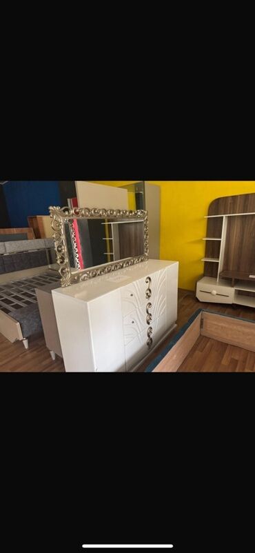 - Komod: Ağ korpus, ön hissədə relyefli naxış və qızılı/bronz dekor elementləri ilə. Üstündə böyük dekorativ çərçivəli üfüqi güzgü.