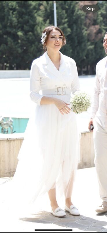 Ağ rəngli, ziyafet donu turkiyeden alınıb 250 $ üzerindeki işlemeler el işidir - Siluet: bədənə oturan, aşağı hissədə yüngül ətək və qısa quyruq - Parça: hamar atlas effektli ətək; üst hissə güpür...