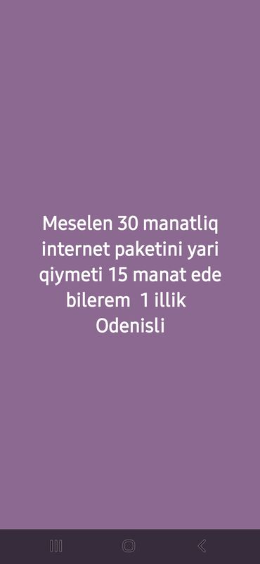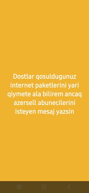 Xidmət: Azercell abunəçiləri üçün internet paketlərini yarı qiymətə aktivləşdirmə ede bilenler hamsi 20.25.30 manata edir men 5 manata her kesi fikirlesib edirem