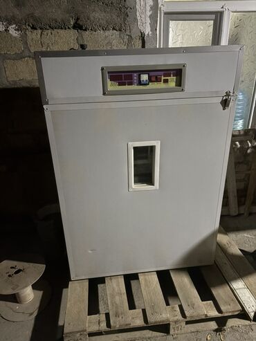 - Yumurta inkubatoru: iri ölçülü şkaf tipli korpus, ön qapıda müşahidə pəncərəsi, üst paneldə rəqəmsal idarəetmə, temperatur və döndərmə üçün elektron nəzarət, havalandırma çıxışı. Palet üzərində saxlanılır.