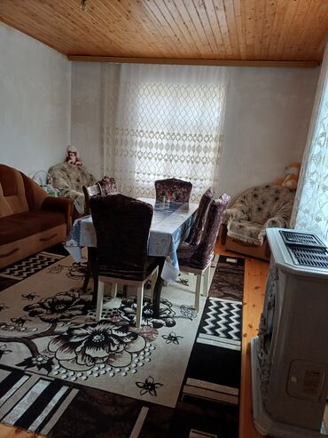 - İşıqlı qonaq otağı – taxta tavan, iri pəncərələr, pərdə ilə işıqlandırma, xalça örtüklü döşəmə.